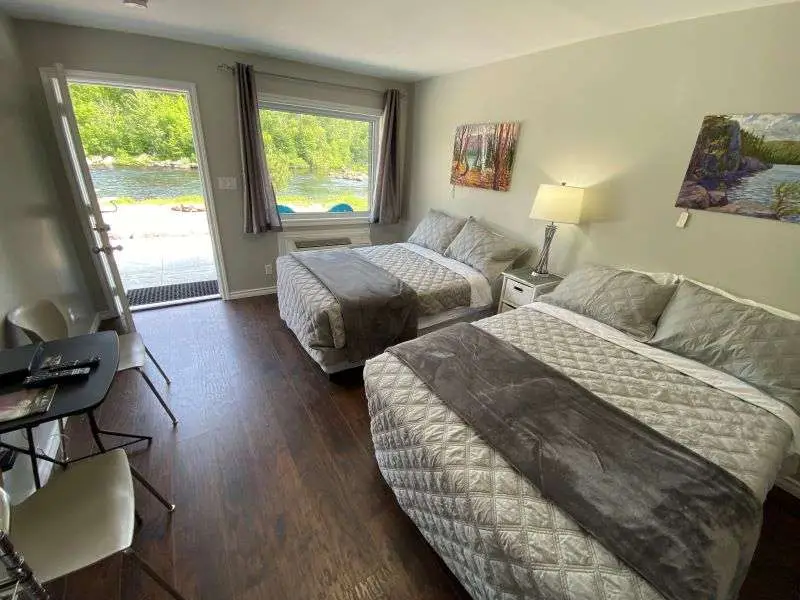 The Rolling Rapids Motel, located on the Madawaska River in downtown Whitney near Algonquin Park’s East Gate, offers a tranquil waterfront experience. It features 13 unique rooms, some with direct river views, and provides free access to bicycles, kayaks, canoes, and paddleboards. Guests can enjoy fishing, barbecuing, or relaxing in Muskoka chairs, taking in the scenic river views. We’re thrilled to provide our guests with complimentary Algonquin Park passes and free equipment rentals, allowing you to immerse yourself in the park’s breathtaking natural landscapes without incurring extra costs.
